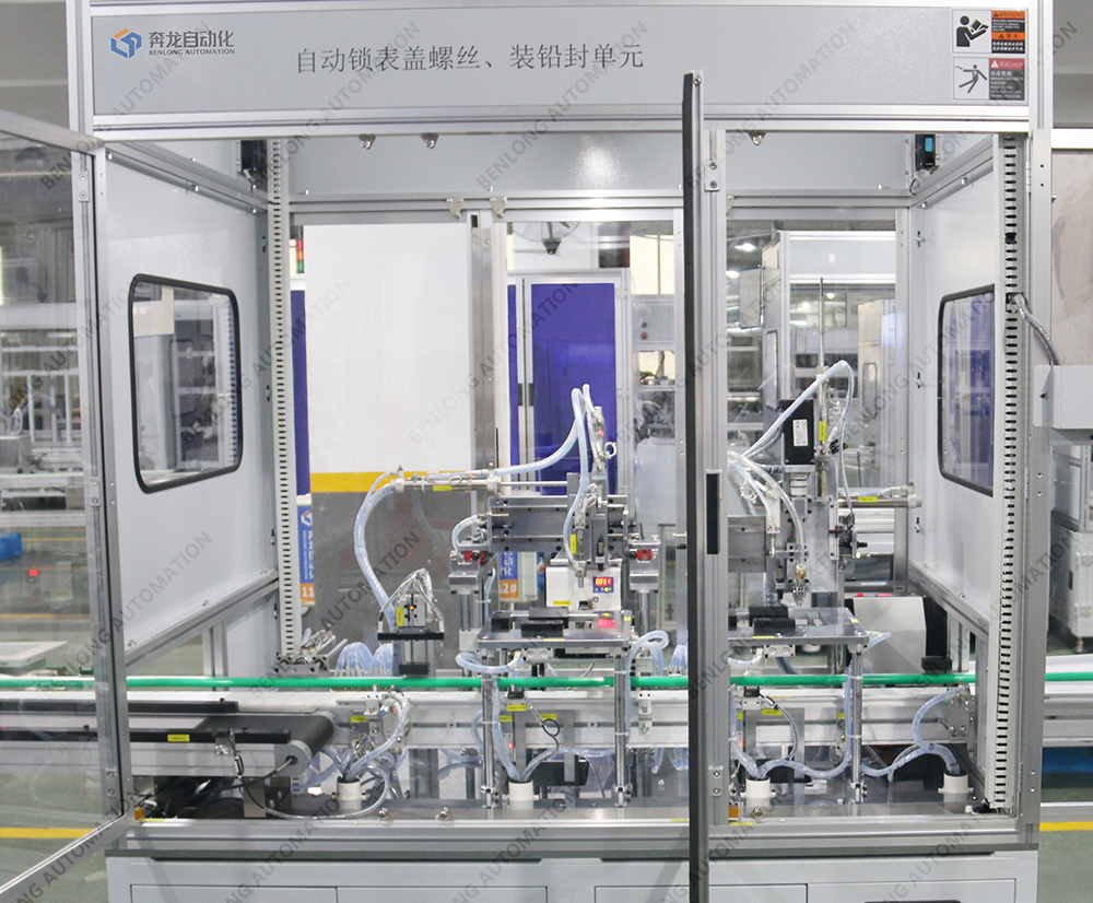 具有产品自动上料底座、装配导电柱、装配线路板、锡焊、锁螺丝、装配密封圈、装配玻璃罩、装配外圈、锁螺丝、特性检测、