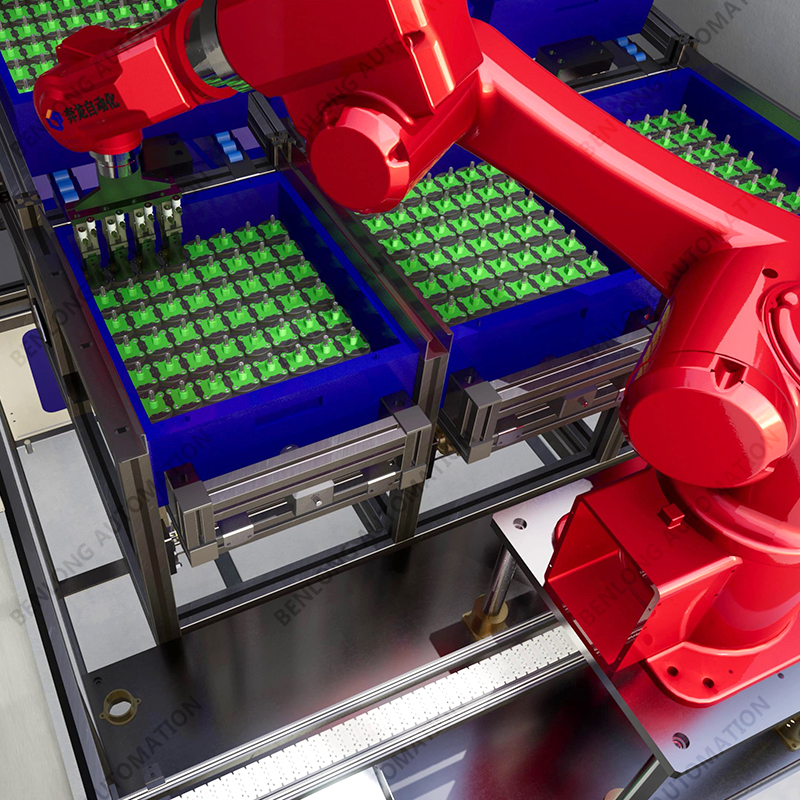 具有产品机器人自动上料、动触架装配、静触片锁螺丝、底座基座压装磁铁、左基座组件装配、右基座组件装配、