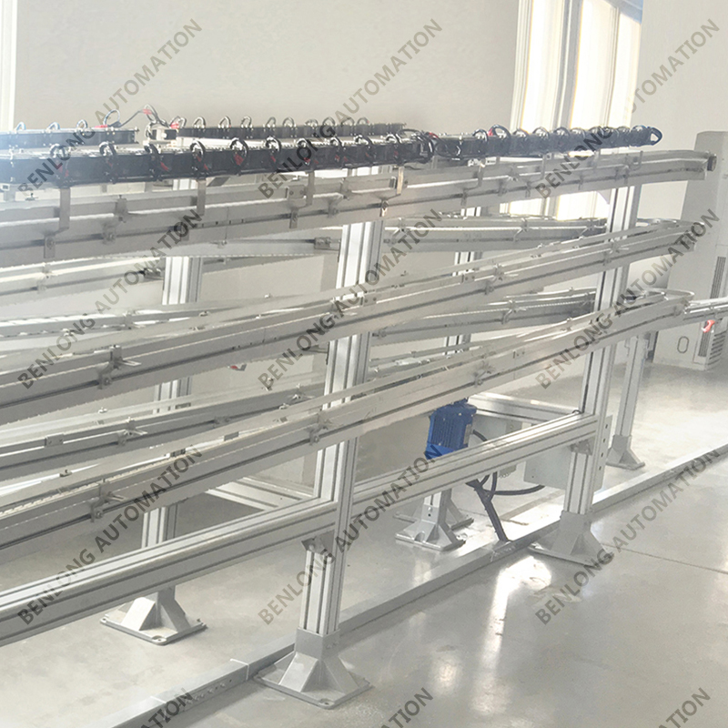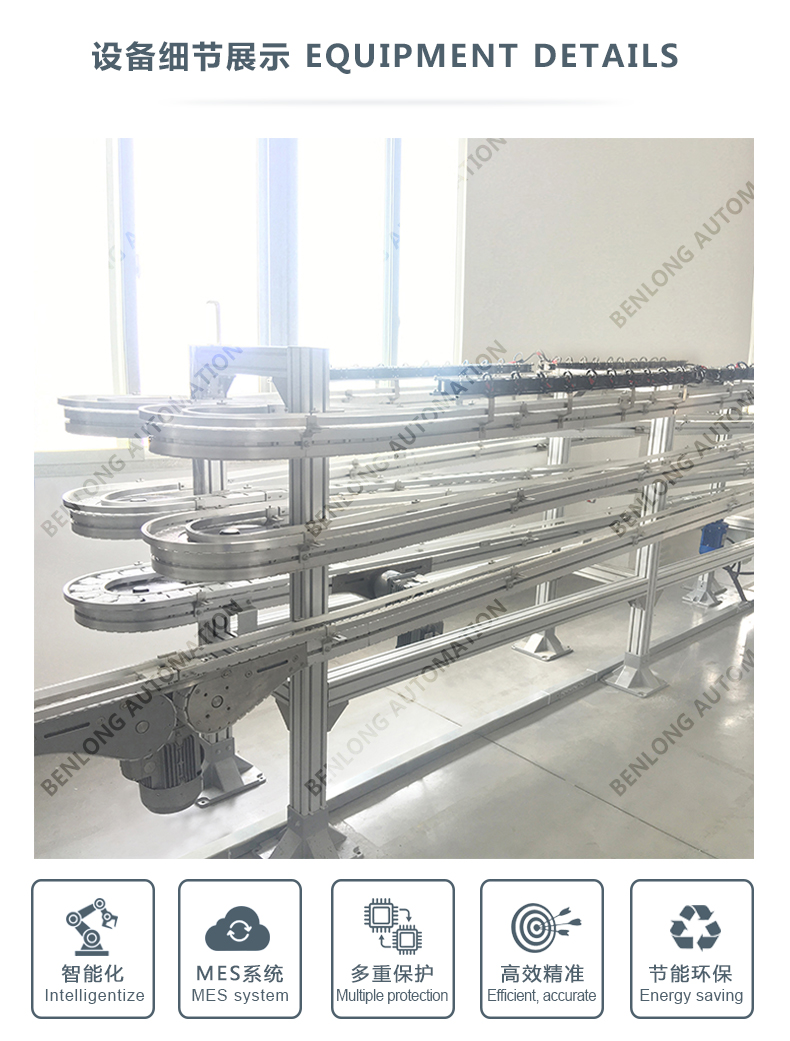 3、物流输送选配:根据产品的不同生产工艺及要求,可以采用平面皮带输送线、链板输送线、倍速链输送线、提升机+输送线、循环输送线等方式实现。