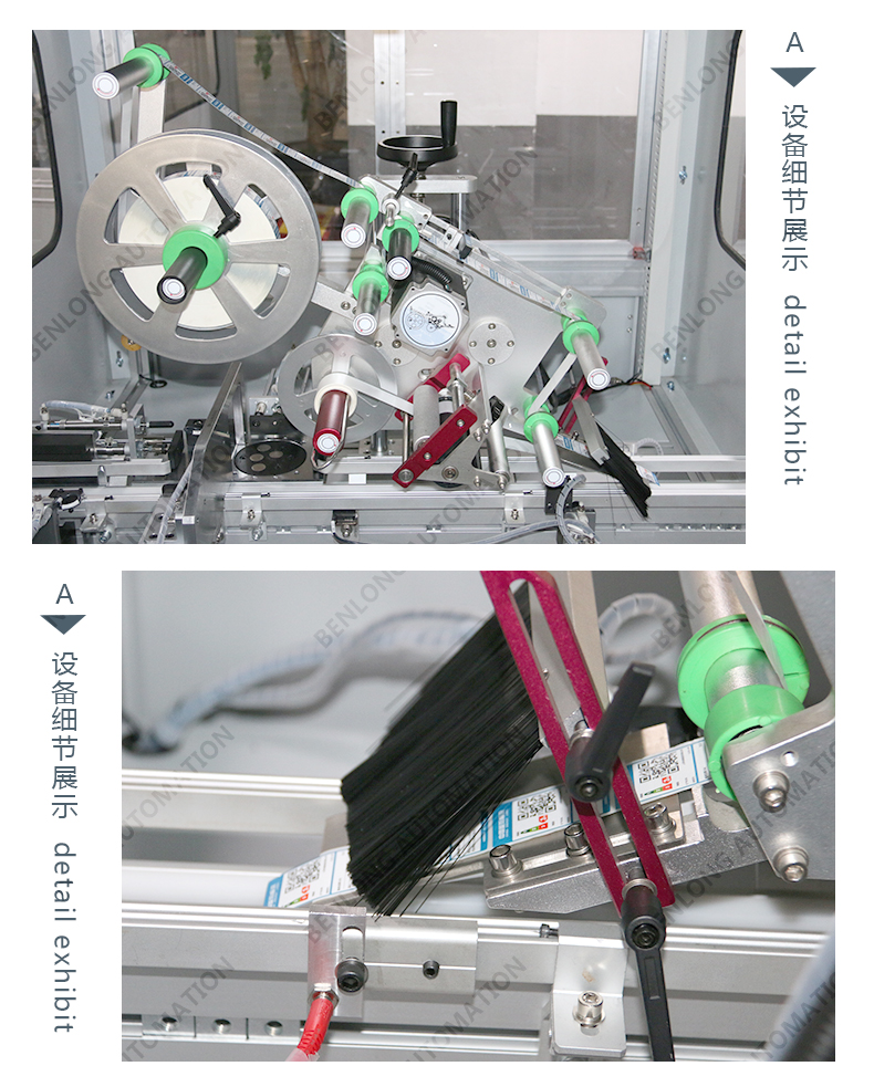 具有自动贴标(二维码标签、条形码标签、ID码标签、图案等)、CCD检测、不良品区分、缺料报警、竖立翻转水平、水平翻转竖立等工序的在线监测、