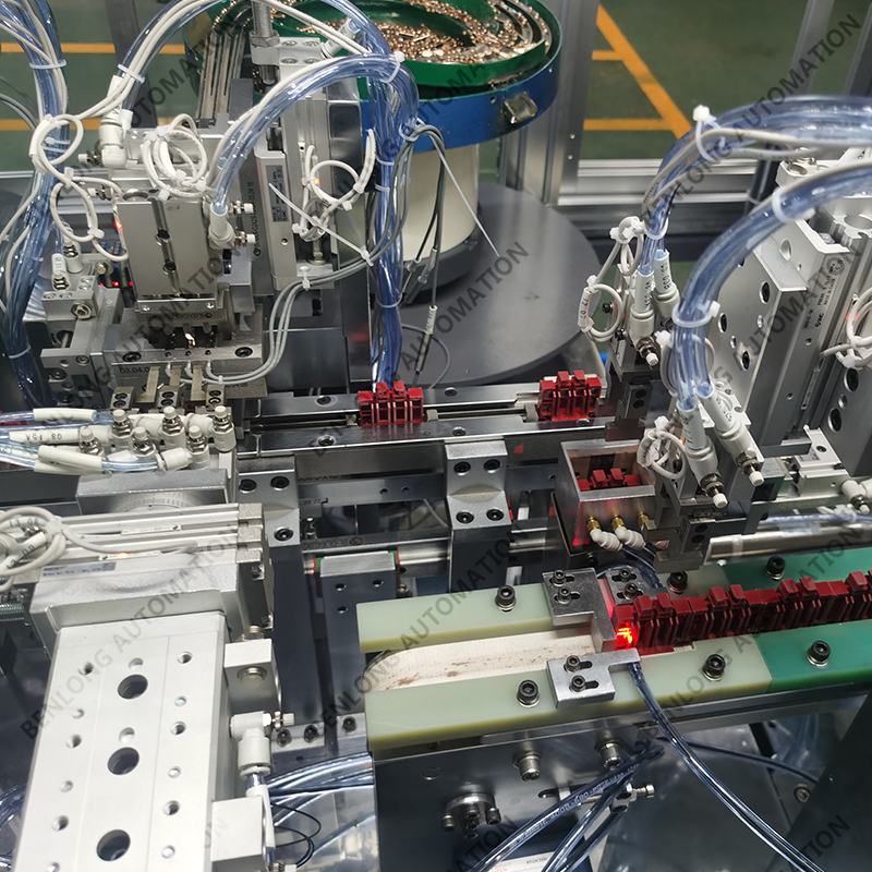 具有自动上料、插芯装配、底座装配、主辅静触头装配、人工装配宝塔弹簧、锁上下盖螺丝、锁瓦片螺丝、通断、耐压、功耗、