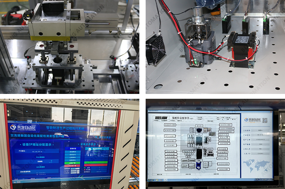 具有自动上料、插芯装配、底座装配、主辅静触头装配、人工装配宝塔弹簧、锁上下盖螺丝、锁瓦片螺丝、通断、耐压、功耗、