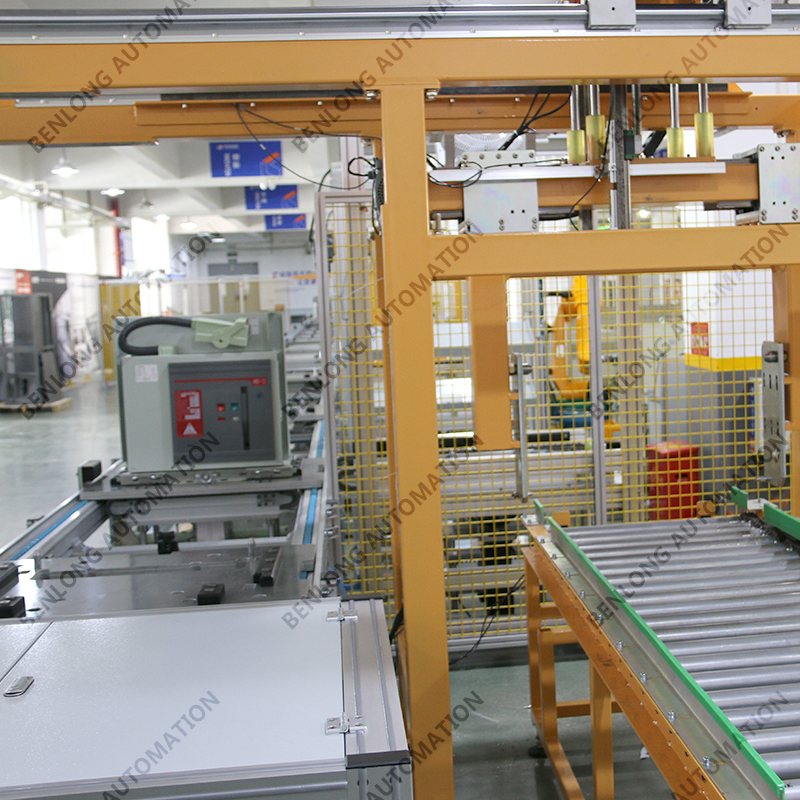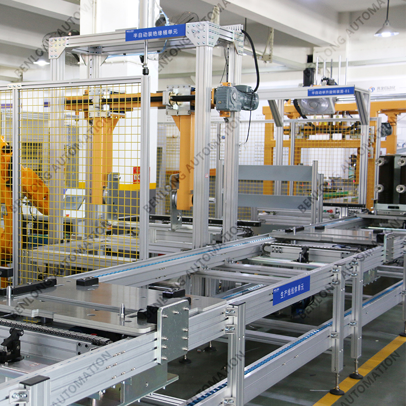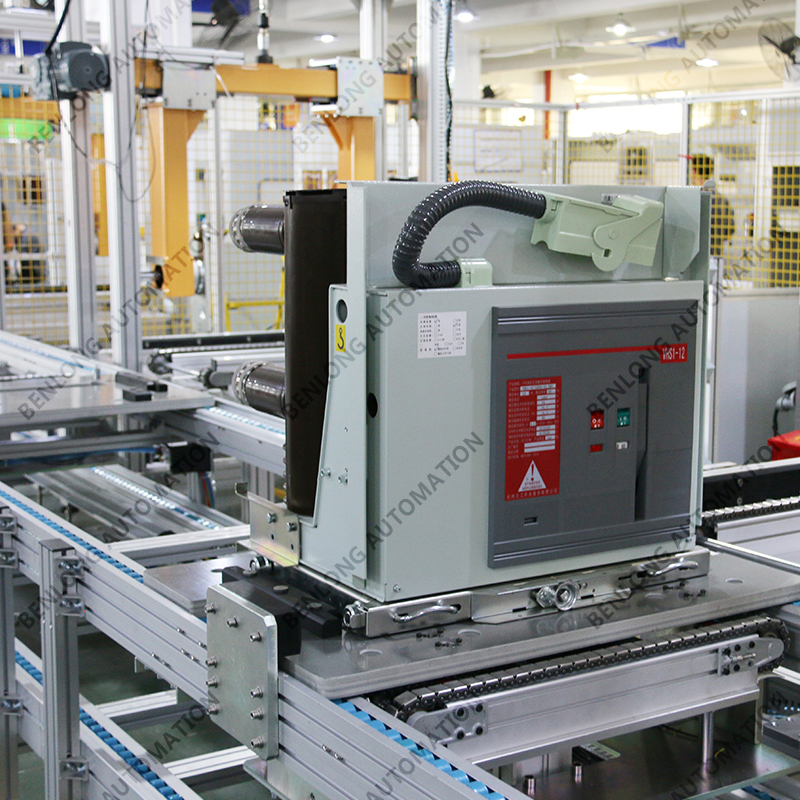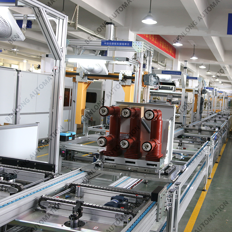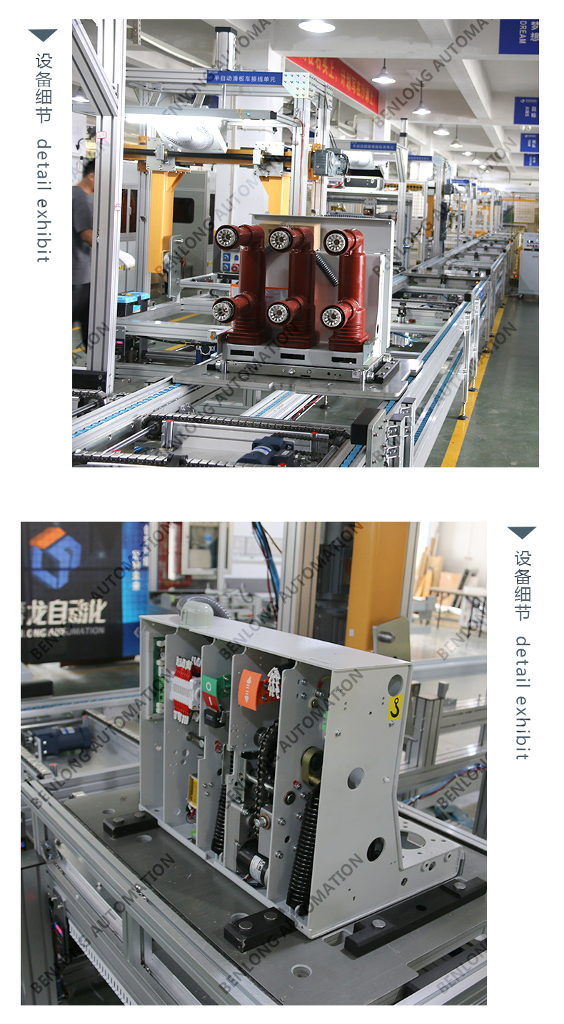 具有自动AGV物流输送、龙门架自动上料、倍速链物流、绝缘筒装配、灭弧室装配、初调装配、初调翻转、机器人锁螺丝、开距、超程、