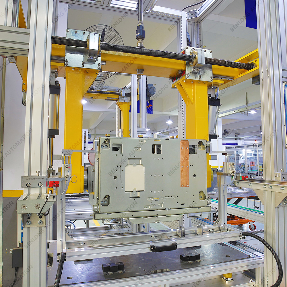 车翻转、底盘车接线、外观封板装配、二次综合检测、龙门架自动下料、包装、码垛、AGV物流输送、缺料