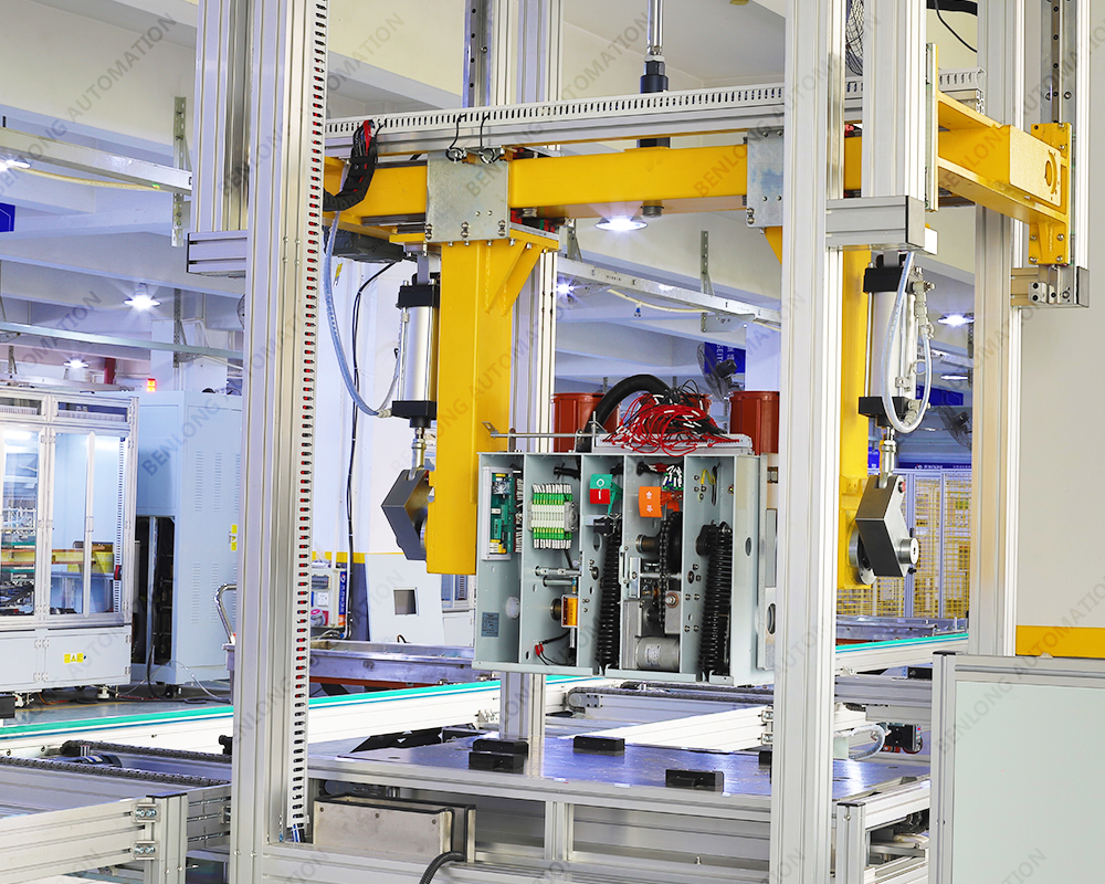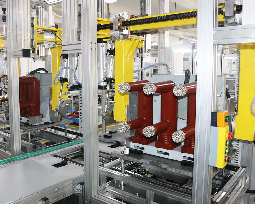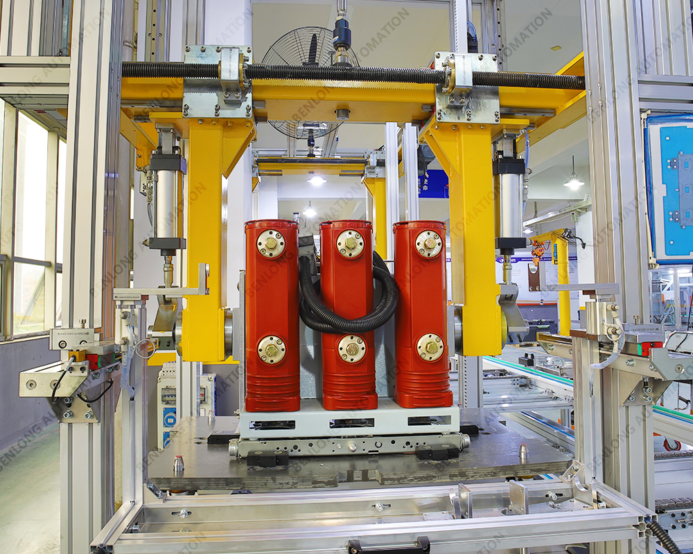 具有自动AGV物流输送、龙门架自动上料、倍速链物流、绝缘筒装配、灭弧室装配、初调装配、初调翻转、