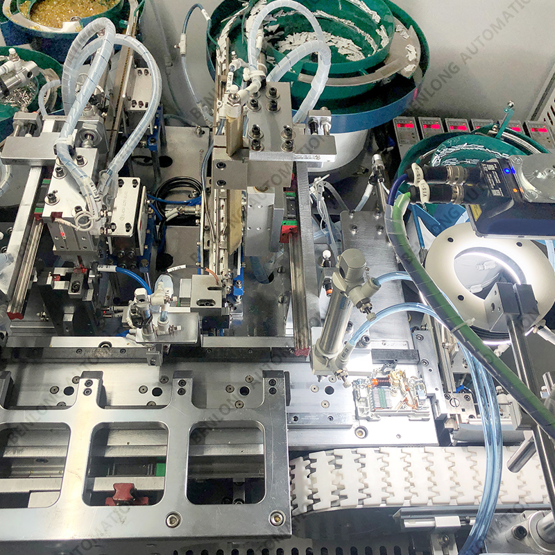 具有产品机器人自动上料、装配、多极拼装、喷码/激光打二维码、穿钉、铆接、瞬时、机器人+延时检测、冷却、机器人