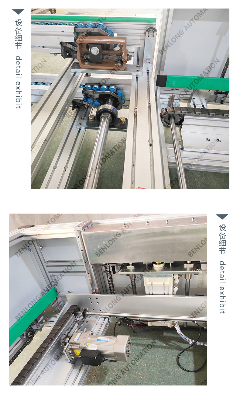 5、待检区说明:转弯处改用顶升旋转滚筒线,产品从**条装配线进入至滚筒线,然后气缸顶起,旋转90°后下沉,由滚筒输送至第二条待检线,要