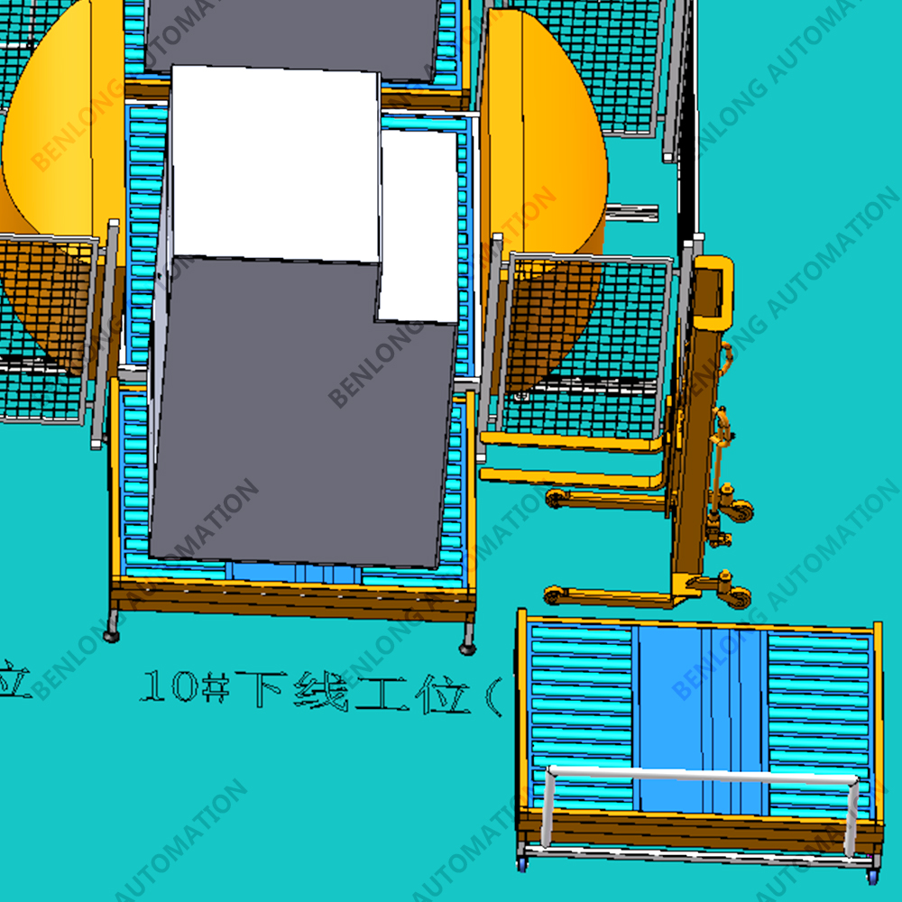 具有产品自动上料、产品自动分配至各工位、机器人自动装配、自动检测、机器人自动锁螺丝、自动检测、自动下料、