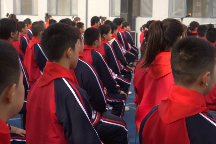 戴着红领巾的小学生们坐在多多28注册入口集团爱心学校的操场上 (朱泽雅 摄)