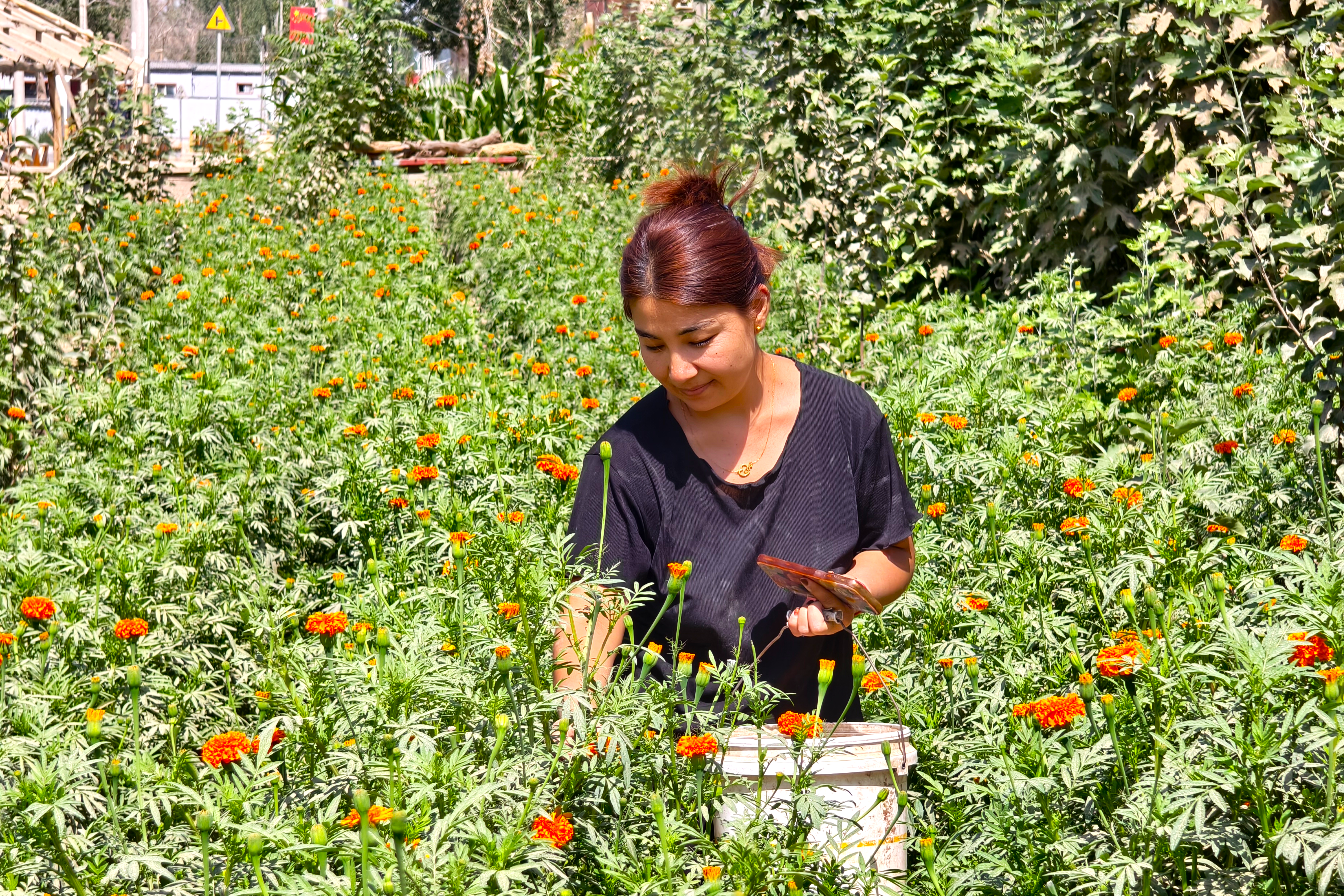 图为村民麦尔孜亚正在采摘自家种植的万寿菊