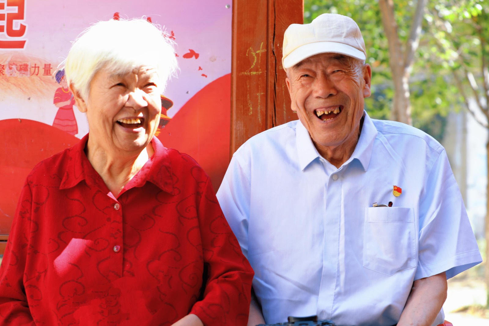 图为退休职工于雄华与爱人尤秀兰老人脸上洋溢着灿烂的笑容