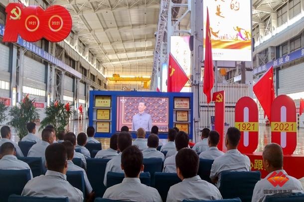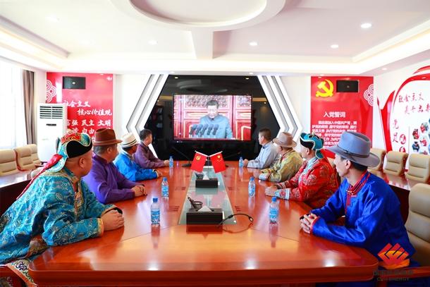 图为胜利能源露天矿蒙古族员工在会议室收看庆祝中国共产党成立100周年大会盛况