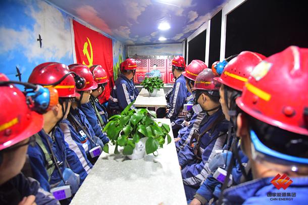 图为神东大柳塔综采五队在井下收看庆祝中国共产党成立100周年大会盛况
