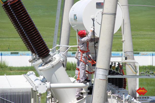 A worker of GD Power’s Inner Mongolia New Energy Co., Ltd. checks electric transmission and transformation equipment.