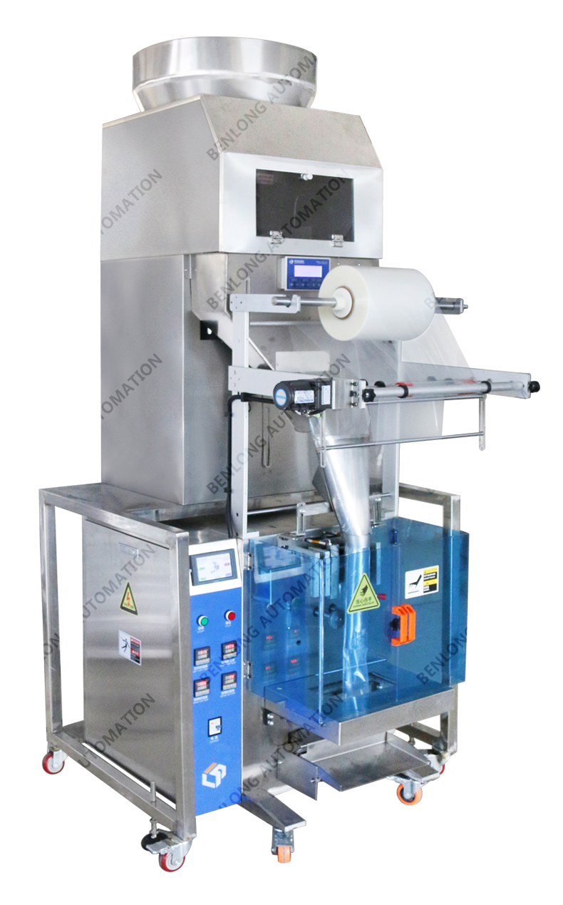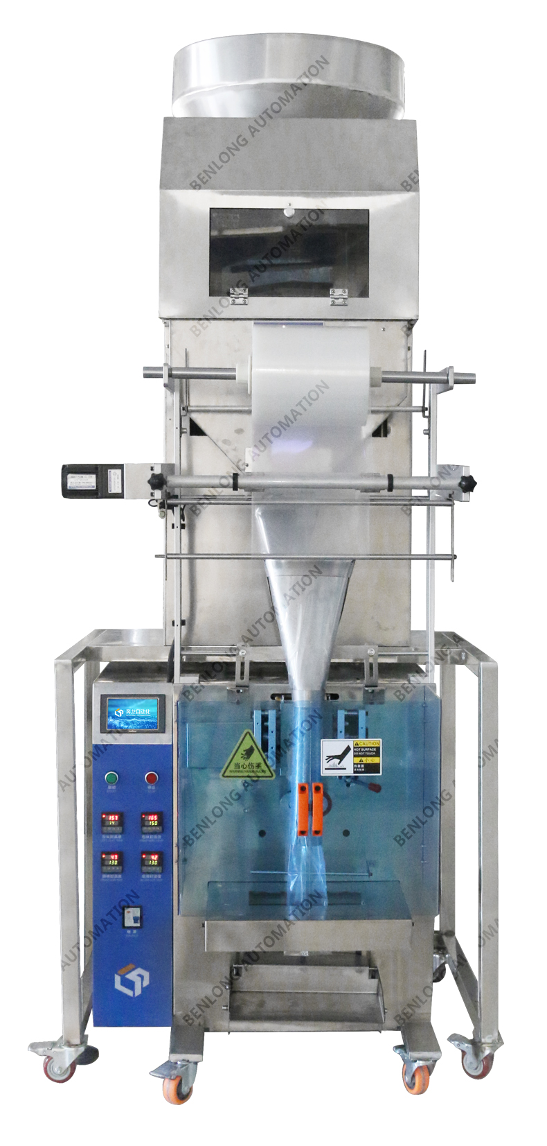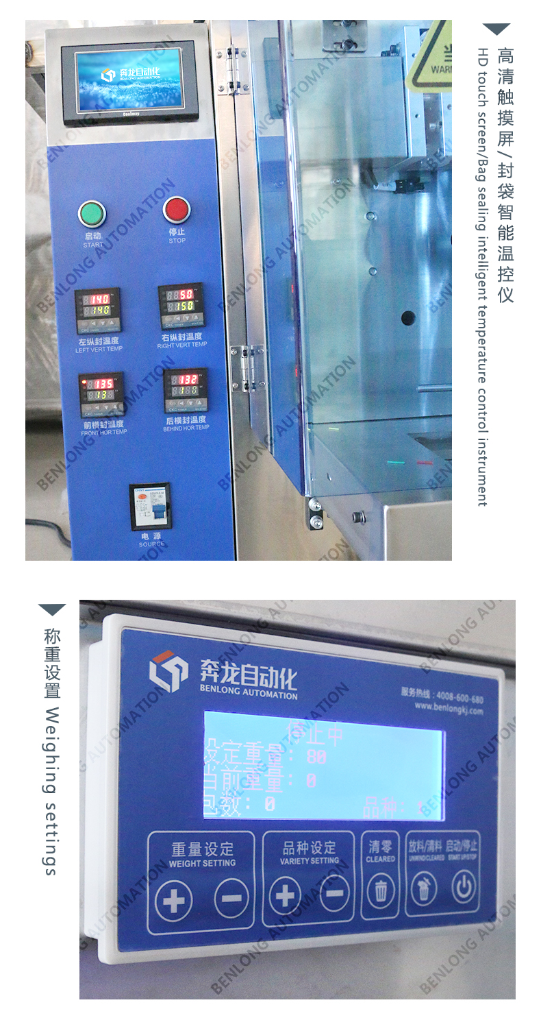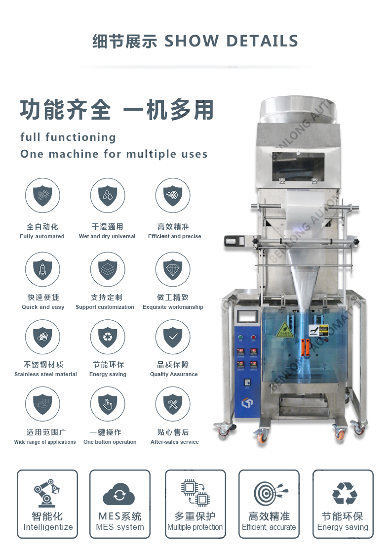 分装机自动称重,自动投料,自动感应落料,自动封切,自动出包;可单品或者多品种混合称重投料包装。