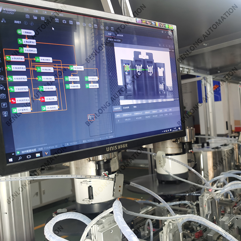 具有自动上料、插芯装配、底座装配、主辅静触头装配、人工装配宝塔弹簧、锁上下盖螺丝、锁瓦片螺丝、通断、耐压、功耗、