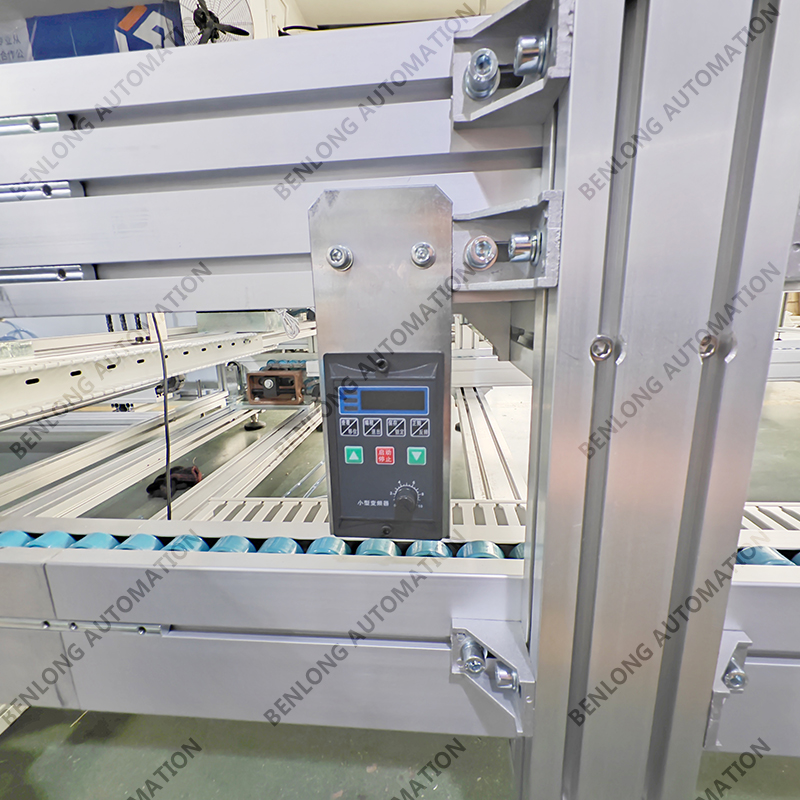 5、待检区说明:转弯处改用顶升旋转滚筒线,产品从**条装配线进入至滚筒线,然后气缸顶起,旋转90°后下沉,由滚筒输送至第二条待检线,要
